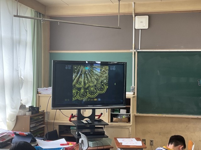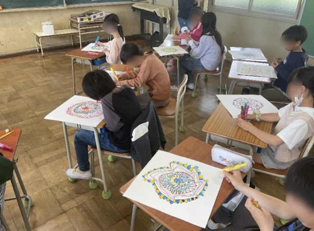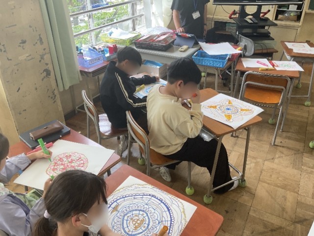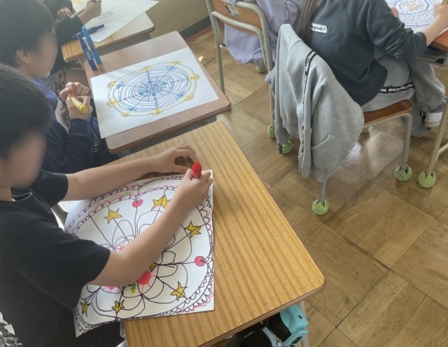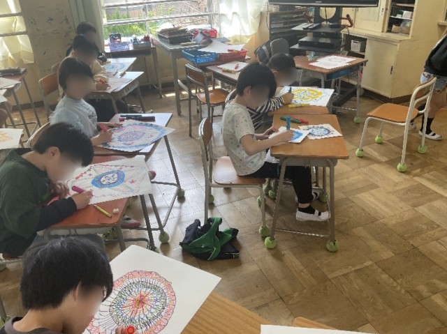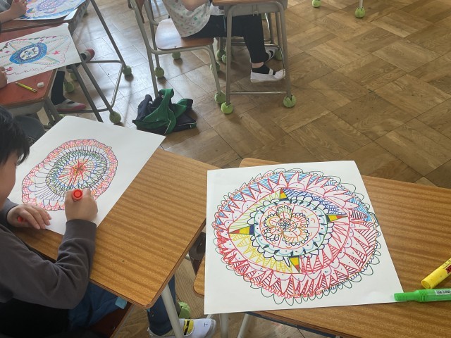 まるでレースのような模様をマジックで紡いでいきます。はじめに1色から始め、色々な色のマジックで紡いでいきます。同じ模様を連続して幾何学的な模様にしたり、その中にモチーフを挟んだり、思い思いの模様を紡いでいきます。模様の入れ方や色使いにも一人一人の思いが詰まっていて、どれも素敵な作品になっています。みんなの集中力も素晴らしかったです。