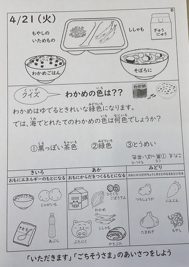 明日は、これもみんなに人気のわかめご飯の登場!楽しみですね。