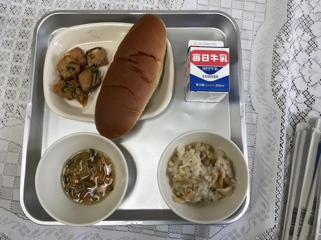 厚揚げの味噌炒め、はるさめスープ、たけのこおこわ