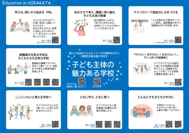 このポスターには、枚方のめざす教育の魅力が詰まっています。枚方の教育それぞれの取組の詳細がQRコードを読み込んでいただくことでご覧いただけます。枚方の教育の特長を感じていただけると幸いです。