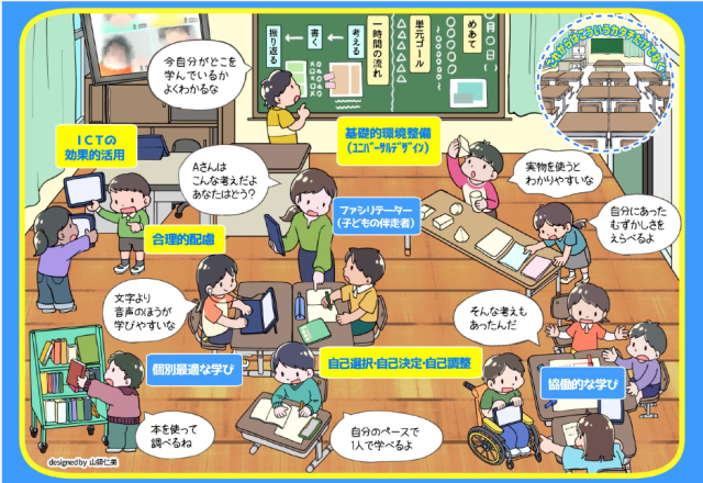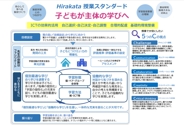 枚方市では、学習指導要領が示す、これからの子どもたちに必要な資質・能力を育成するために、Cから始まる5つの視点を大切にします。1人1台端末を活用し、5つのCの視点を意識し、「学びに向かう力、人間性等」「知識及び技能」「思考力、判断力、表現力等」を身につけていきます。