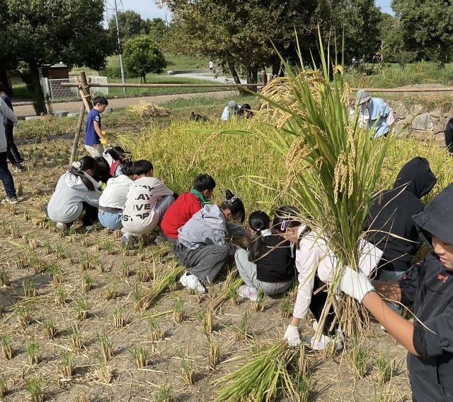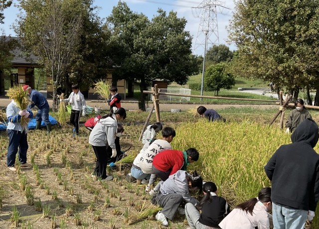 10月14日(火)5年生 🌾稲刈り体験 公開日 2025/10/14 更新日 2025/10/14 学校の様子 5年生は2・3時間目に山田池公園で貴重な稲刈り体験をさせていただきました。6月に植えた苗が立派な稲穂🌾に成長していました。1人ひとり鎌を持って、根元から5cmくらい残して刈ります。慎重かつ丁寧に刈っていました。山田池公園のスタッフの皆様、ありがとうございました。 +1 いいね(2)