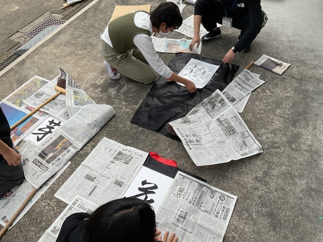 運動会練習も佳境に入り、6年生はソーラン節の踊りで着る法被に、それぞれが選んだ「一文字」を描いていました。