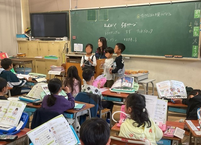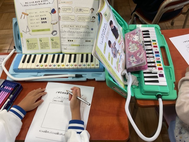 11月4日(火)1年生 授業の様子 公開日 2025/11/04 更新日 2025/11/04 学校の様子 音楽:素敵な音を見つけよう。カスタネット、トライアングル、すず、ウッドブロック、タンバリンから好きな楽器を選んで、歌と一緒に音を鳴らして、音楽を楽しんでいました。 いいね(0)