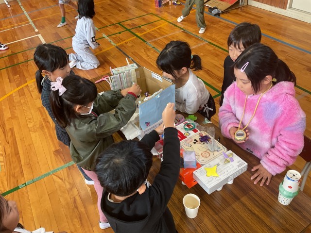 お店屋さんごっこの形式で、2年生が店員役となり、1年生を招待しました。