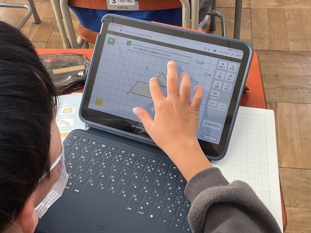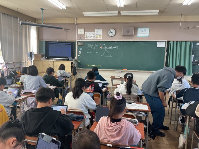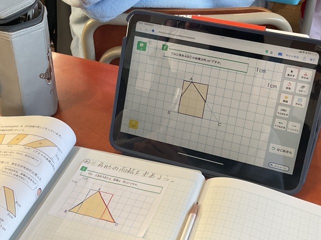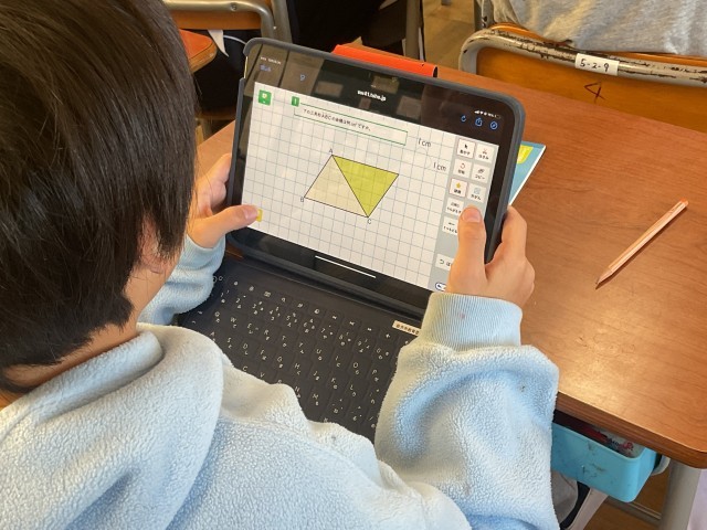 12月2日(火)5年生 授業の様子 公開日 2025/12/02 更新日 2025/12/02 学校の様子 算数めあて:三角形の面積を求めよう。既習の長方形や平行四辺形の面積の求め方を利用して、三角形の面積を求めていました。タブレットで図形を切り取って移動し、長方形や平行四辺形の形にしていました。 +1 いいね(0)