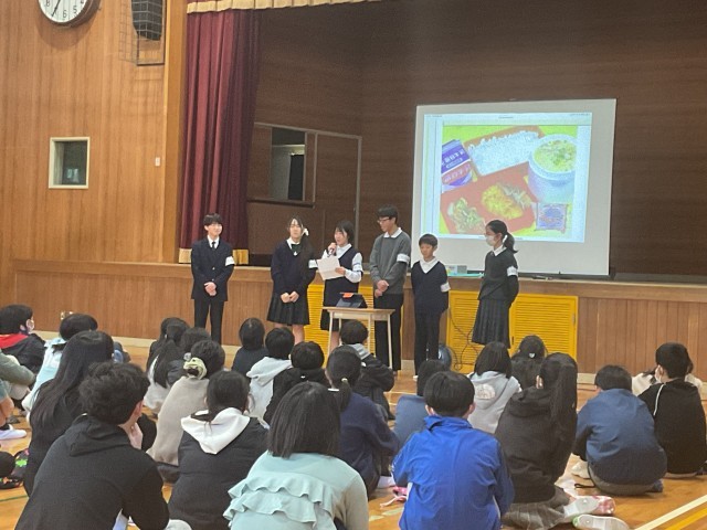 6時間目、杉中学校の生徒会メンバーが来校して、6年生に向けて中学校紹介をしてくれました。