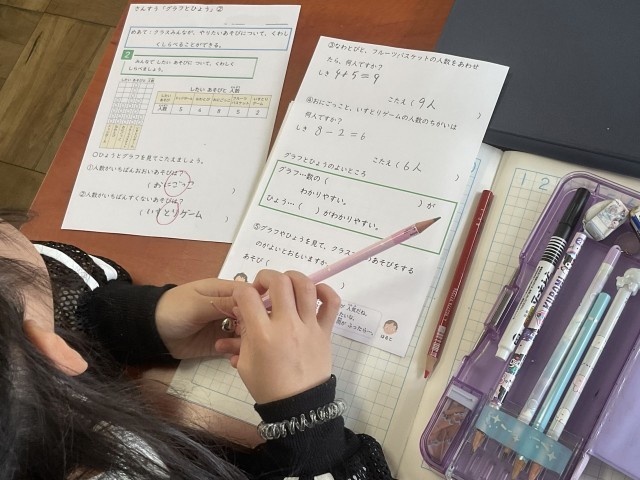 グラフや表から読み取れることについて、みんな確認しながら学習を進めていました。