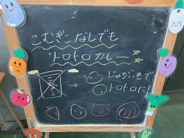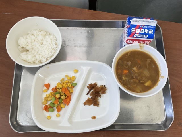 今日のメニューは「ご飯」「牛乳」「小麦粉なしでもトロトロカレー」「コロコロソテー」「福神漬け」でした。今日のカレーのとろみはじゃがいもペーストによるものです。どうでしたか?