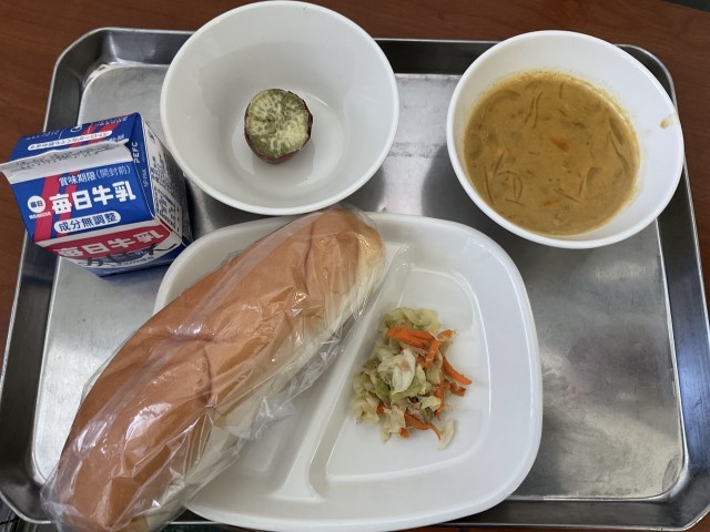 今日のメニューは「コッペパン」「牛乳」「クリーミーなカレー春雨スープ」「ツナとキャベツのソテー」「ふかし芋」でした。カレー春雨スープは令和6年度の給食コンテストの入賞作品です。除去食もカレーのスパイスが効いて美味しかったです。