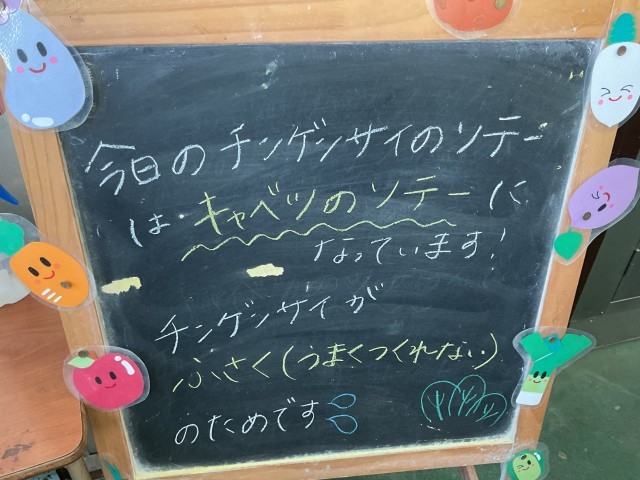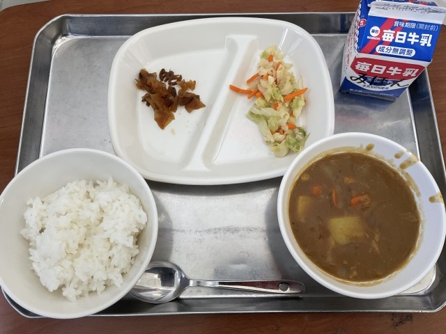 今日のメニューは「ご飯」「牛乳」「チキンカレー」「キャベツのソテー」でした。本来は青梗菜のソテーでしたが食材不足でキャベツに変わりましたが、キャベツの甘みが美味しかったです。