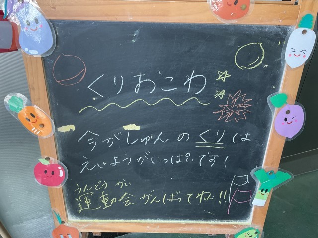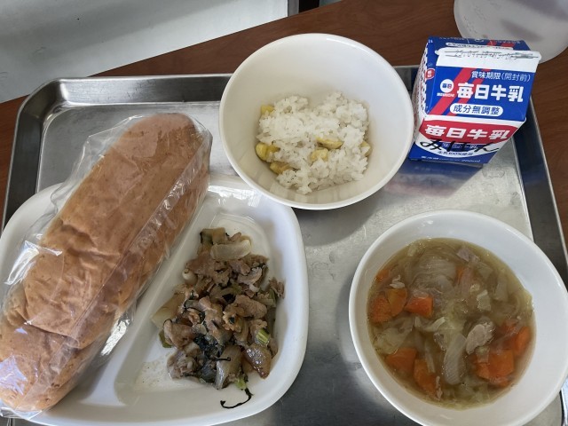 今日のメニューは「ゴマぱん」「牛乳」「野菜スープ」「豚肉のオイスターソース炒め」「クリおこわ」でした。栗オコワはなんといっても秋の味覚でした。