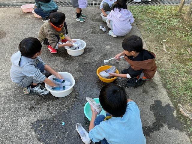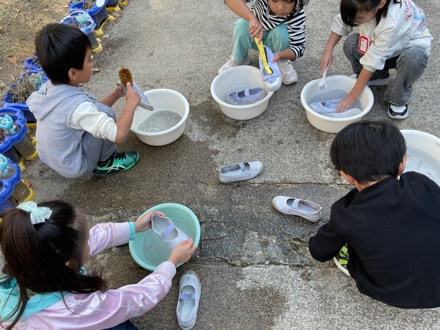 1年生が生活課の一環で「靴洗い」に挑戦しました。特に黒くなった靴の先や裏側をブラシを使って熱心にゴシゴシしていました。