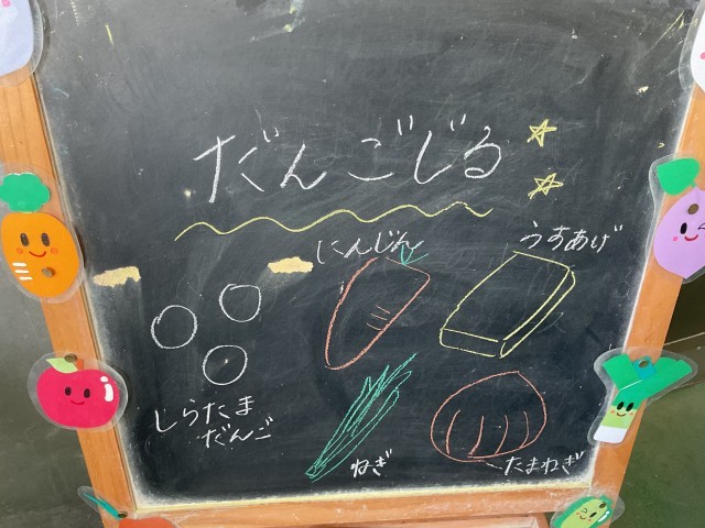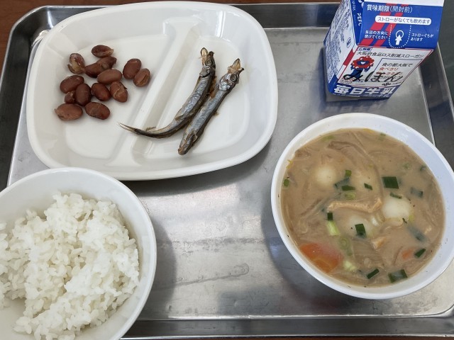 今日のメニューは「ご飯」「牛乳」「団子じる」「ししゃも」「金時豆」でした。