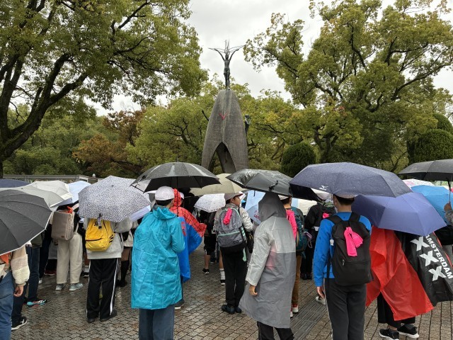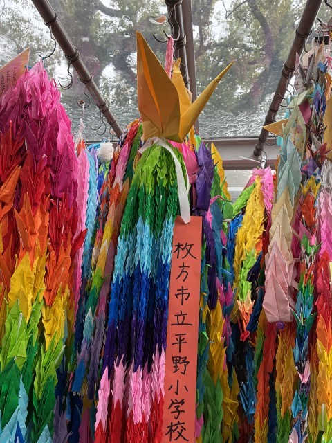 平和公園では、雨の中でしたが、平和の集いを心を込めて行いました。平野小学校のみんながつくった千羽鶴も捧げることができました。