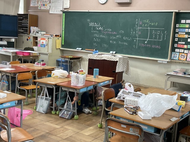 今日は枚方市防災教育の日です。大阪880万人訓練があり、緊急放送が入るとみんなは机の中に避難しました。いつ起こるかわからない地震。いつ起こっても冷静に命を守りましょう。