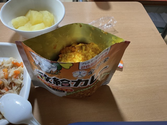 今日のメニューは「ミニコッペパン」「牛乳」「きゅうきゅうカレー(防災食)」「切り干し大根とささみの甘酢あえ」「りんごの缶詰」でした。きゅうきゅうカレーは冷えていても美味しかったです。