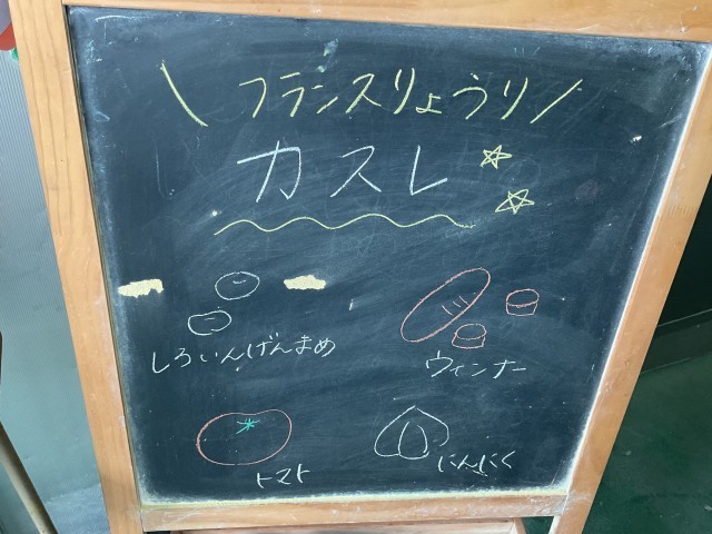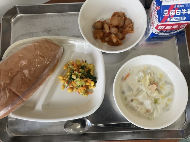 今日のメニューは「コッペパン」「牛乳」「冬野菜の米粉クリームスープ」「カスレ」「コーンソテー」でした。