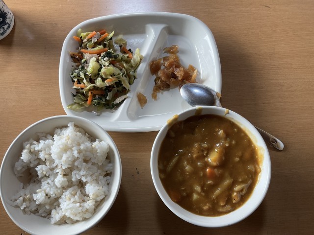 今日のメニューは「玄米ご飯」「牛乳」「チキンカレー」「青梗菜の炒め物」「福神漬け」でした。