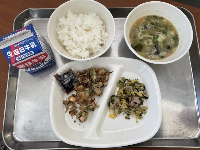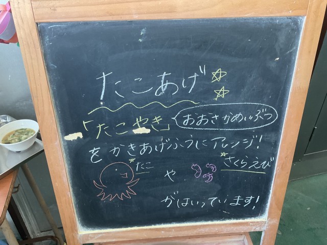 今日のメニューは「ご飯」「牛乳」「味噌汁」「たこ揚げ」「コブクロソース」「小松菜の胡麻炒め」でした。今日の味噌汁はさつまいもが入っていたので、いつも以上にコクが効いていました。