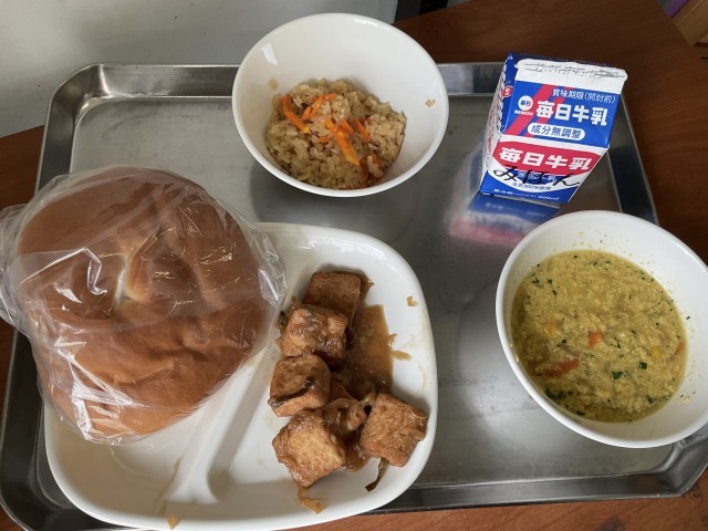 今日のメニューは、「渦巻パン」「牛乳」「卵とコーンのスープ」「厚揚げのオイスターソース炒め」「中華おこわ」でした。卵抜きの除去食のスープはコーンの甘味や風味がよく効いていました。