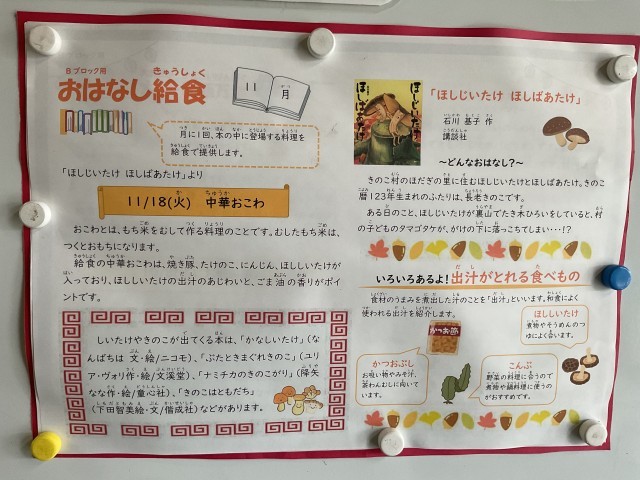 今日はお話し給食でした。中華おこわに入っている干し椎茸が出てくるお話「ほしじいたけ ほしばあたけ」を給食委員会の子どもたちが呼んでくれました。