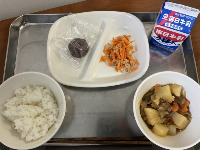 今日のメニューは「ご飯」「牛乳」「豚じゃが」「にんじんしりしり」「おはぎ」でした。おはぎは給食初登場です。1年生に「おはぎ知ってる?」と聞いたところ、知っている子が約半数強でした。