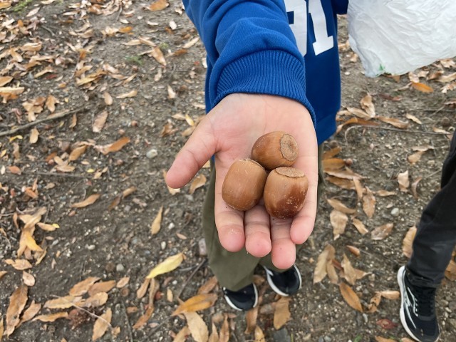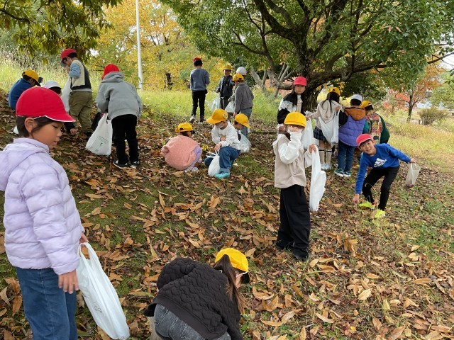 1年生と2年生が手を繋ぎながら、交北公園までどんぐり拾いに行きました。びっくりするくらいクヌギの大きなどんぐりがいっぱい落ちていました。いっぱいになった袋を大事そうに抱えて帰りました。