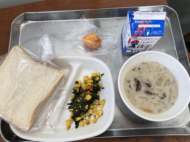 今日のメニューは「食パン」「牛乳」「ビーフストロガノフ」「ほうれん草のソテー」「柿」でした。ビーフストロガノフは新メニューでした。除去食もコクのあるスープでした。
