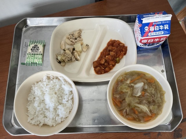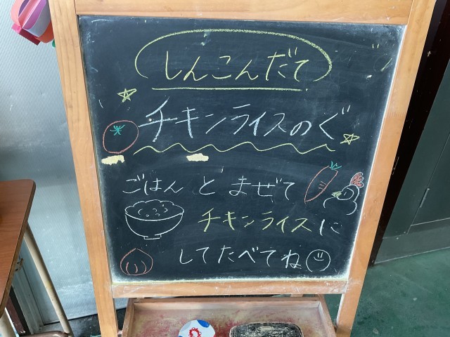 今日のメニューは「ご飯」「牛乳」「ジュリエンヌスープ」「チキンライスの具」「ポテ豆サラダ」でした。チキンライスは初メニューでした。