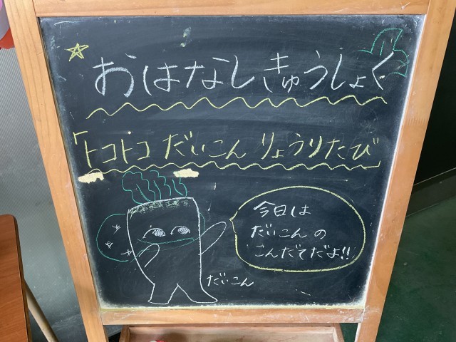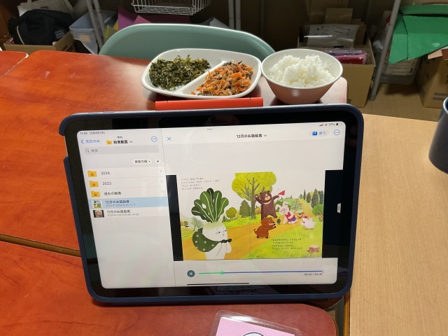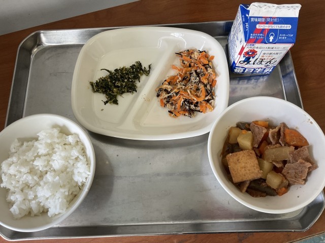 今日のメニューは「ご飯」「牛乳」「豚肉と大根の煮物」「ささみと人参の甘酢あえ」「大根葉の炒り煮」でした。今回は12月のお話給食。動画で「トコトコ大根料理旅」を見ました。