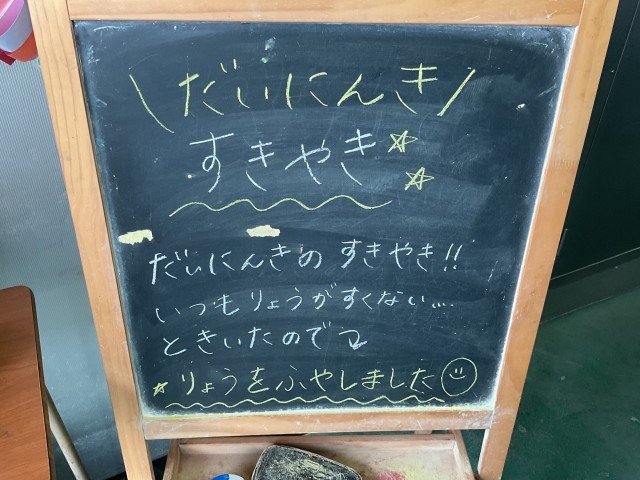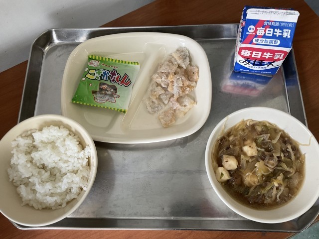 今日のメニューは「ご飯」「牛乳」「すき焼き」「蓮根の唐揚げ」「ミニフィッシュ」でした。