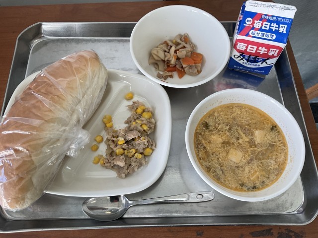 今日のメニューは、「コッペパン」「牛乳」「サンラータン」「ツナコーン」「エリンギの炒め物」でした。「サンラータン」はお酢の酸味と唐辛子の辛味が特徴の「酸っぱ辛い中華スープ」です。給食では辛味酸味をちょっぴりつけての登場でした。