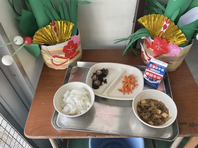 今日のメニューは、「ご飯」「牛乳」「すき焼き」「ニンジンシリシリ」「小豆餅」でした。日本では、小正月(1月15日)に一年の邪気を払い、」健康や無事を願って小豆粥を食べます。