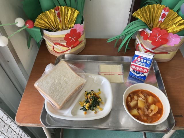 今日のメニューは「食パン」「牛乳」「ポークビーンズ」「ほうれん草のソテー」「スライスチーズ」でした。