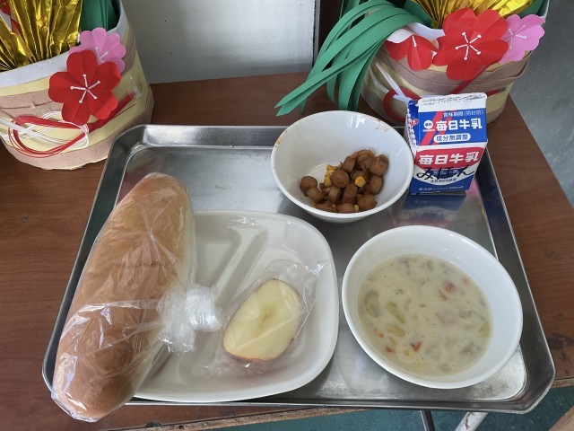 今日のメニューは「コッペパン」「牛乳」「米粉のクリームスープ」「ウインナーのトマト煮」「りんご」でした。今日は1月のお話給食の日でした。給食委員会が用意してくれた「りんごかもしれない」が登場しました。