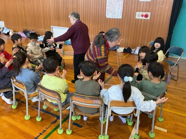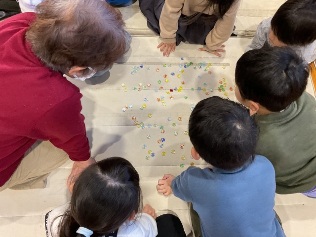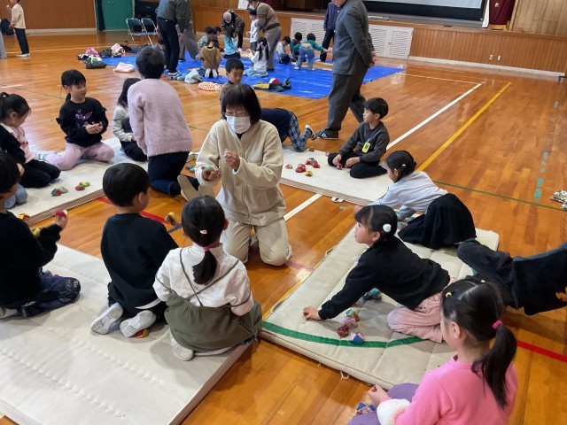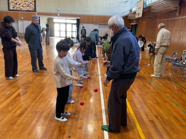 地域の方から昔あそびをしました。メニューは、お手玉、けん玉、こま、おはじき、あやとりでした。子どもたちと地域の皆さんの嬉しい顔が嬉しかったです。