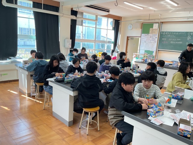 理科の時間には蓄電池の学習をします。実験用具は1人1台あります。