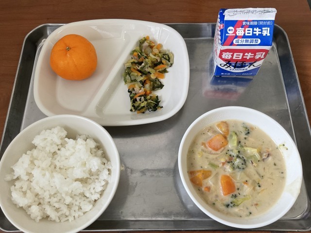 今日のメニューは「ご飯」「牛乳」「寒い冬もへっちゃら!?心も体もあったまる和風シチュー」「白菜の炒め物」「ポンカン」でした。シチューは枚方市内の児童が考えたメニューです。実は中にブリが入っていました。