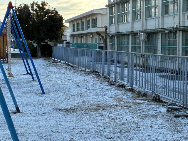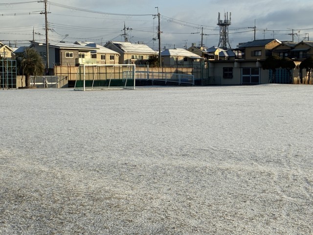 全国的な寒波襲来で運動場が真っ白に染まりました。