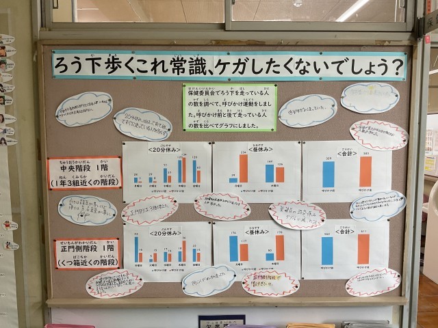 給食掲示板の隣には、保健掲示板があります。今回は廊下を走る人調べ。走らないように声をかけながら調査、保健委員会の皆さんがやってくれました。