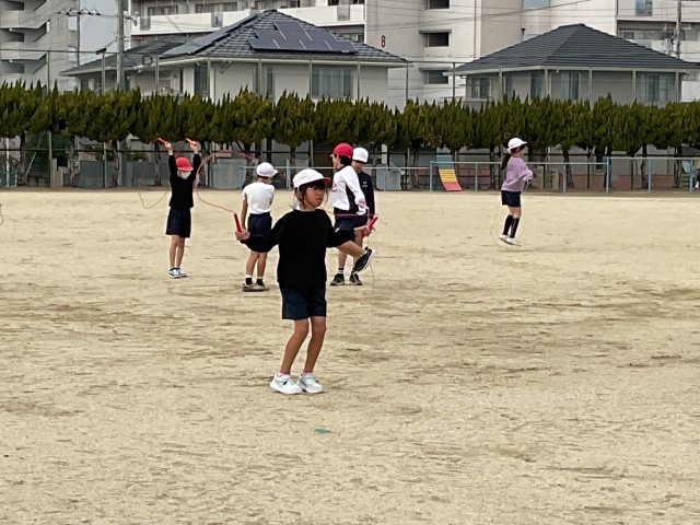 寒い中ですが縄跳びに挑戦!二重跳びのコツはつなをいかに早く回せるかにかかっています。