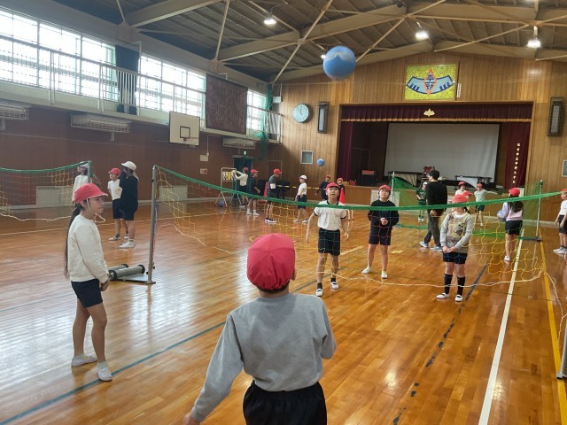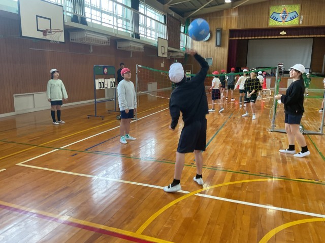 5年生の体育ではソフトバレーをしています。サーブは上手にできていますが、パスが難しそうでした。でもとっても楽しいようです。