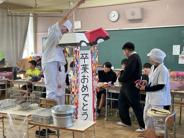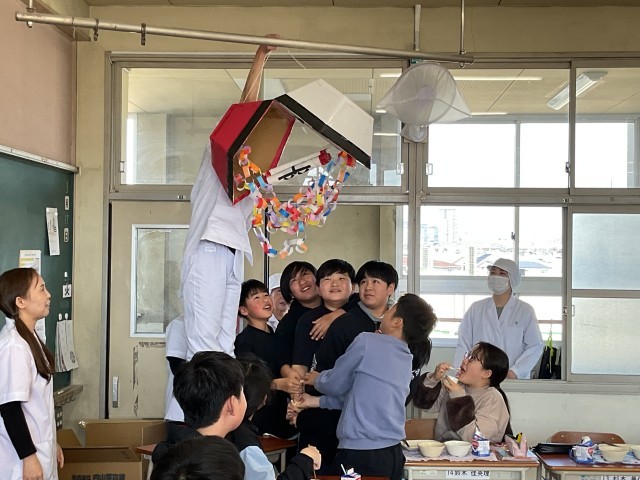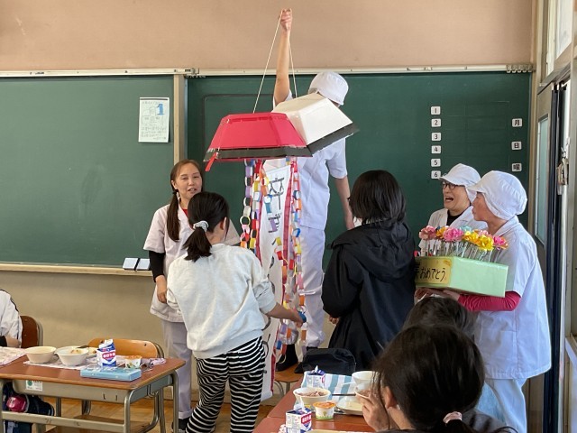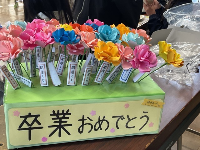 調理員さんからサプライズのプレゼントです。ポケモンボールを開けるとくす玉に!見事「卒業おめでとう」の文字が見えました。1人1本ずつの開運くじもいただきました。