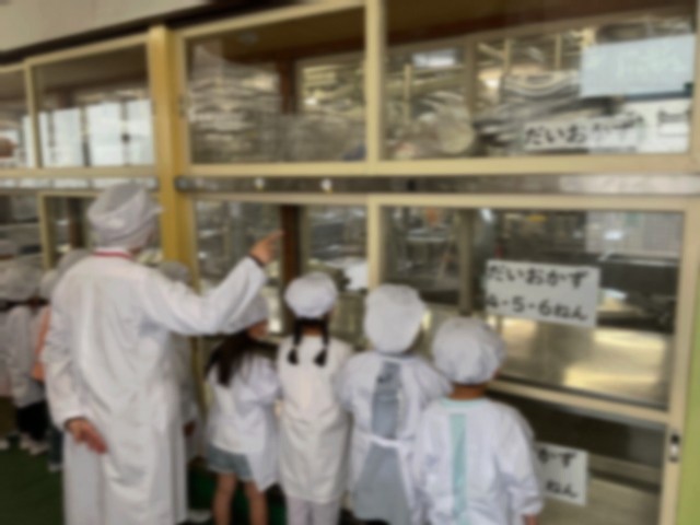 1年生は4月15日から給食開始です。その前に、食物アレルギーのことや、調理場のことを学びました。実際に調理されている様子を見て、お鍋の大きさや野菜の多さに子どもたちは驚いていました。