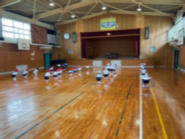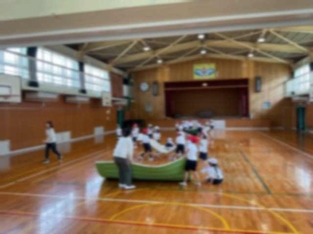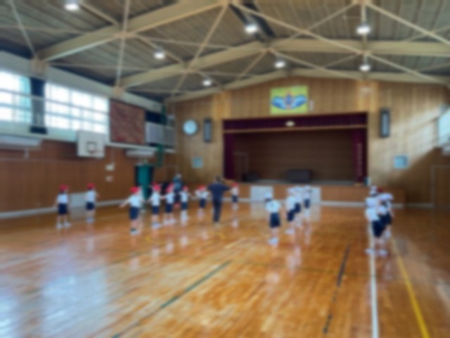 体育館で体操をしました。屈伸運動など先生の動きに合わせて動くことができました。マットの片づけも協力して取り組めました。