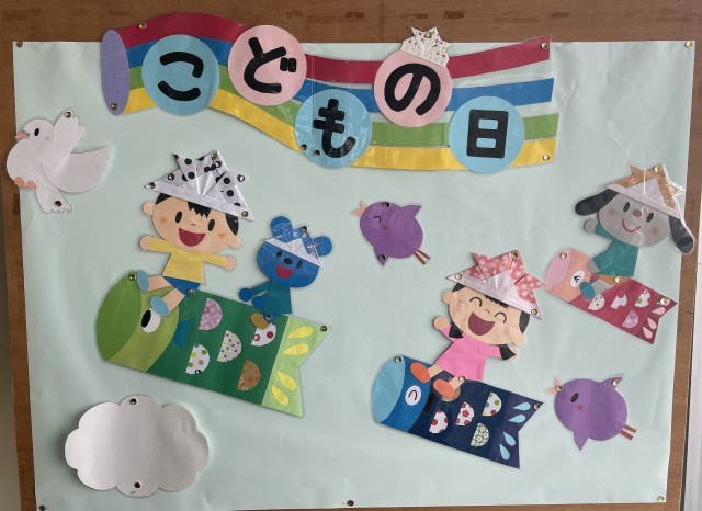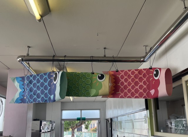 5月を迎えるにあたり、鯉のぼりなどを飾ってくれています。給食をとりに来た子どもたちが「鯉のぼりやー」と大きな声でいいながら喜んでいました。