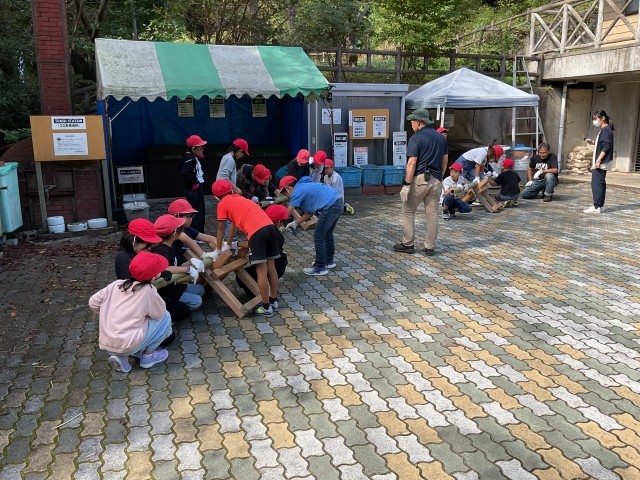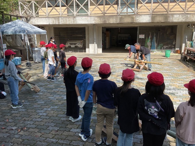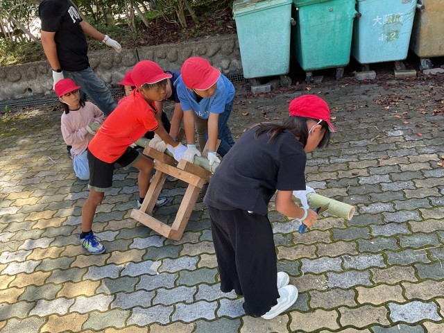 2組は竹切り体験、1組は焼き板に絵付け体験をします。