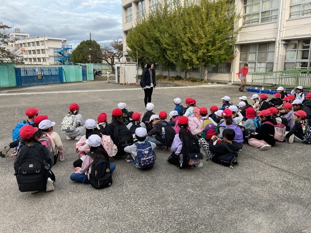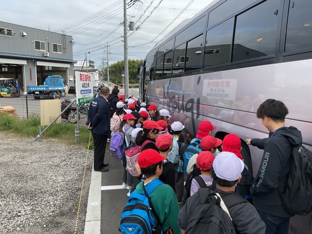 2年生全員が校外学習に出発しました。出発前の先生からのお話をしっかりと聞いています。