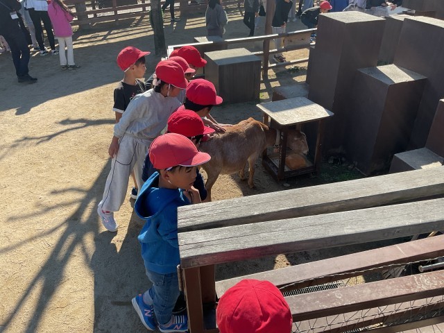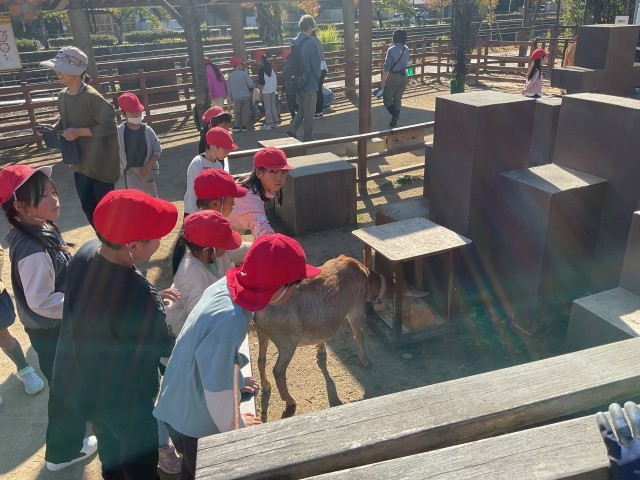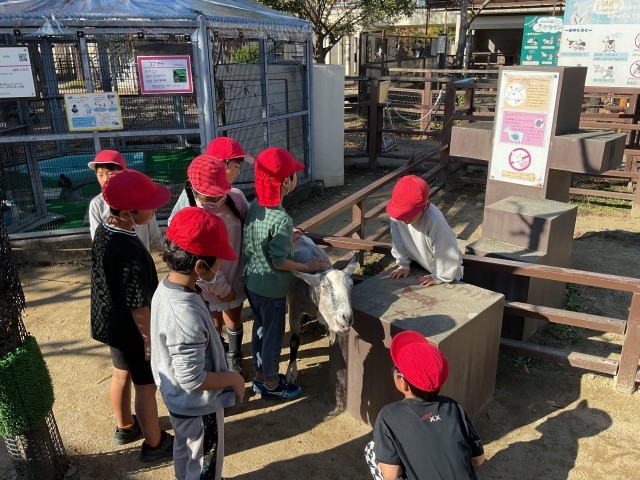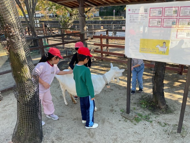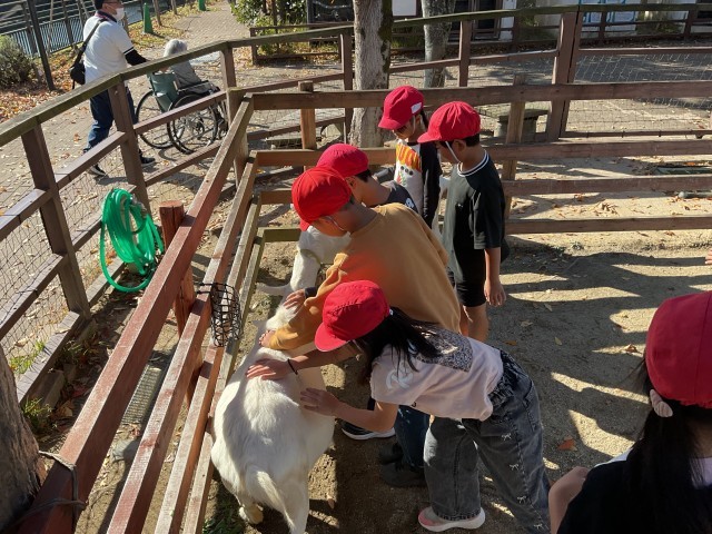 餌やりを終えると、柵の中に入り、ヤギを間近で見たり、触ったりしました。ヤギによって毛の触った感じが違うかったり、普段体験できない体験ができました。この後、バスに乗り学校に向けて出発しました。